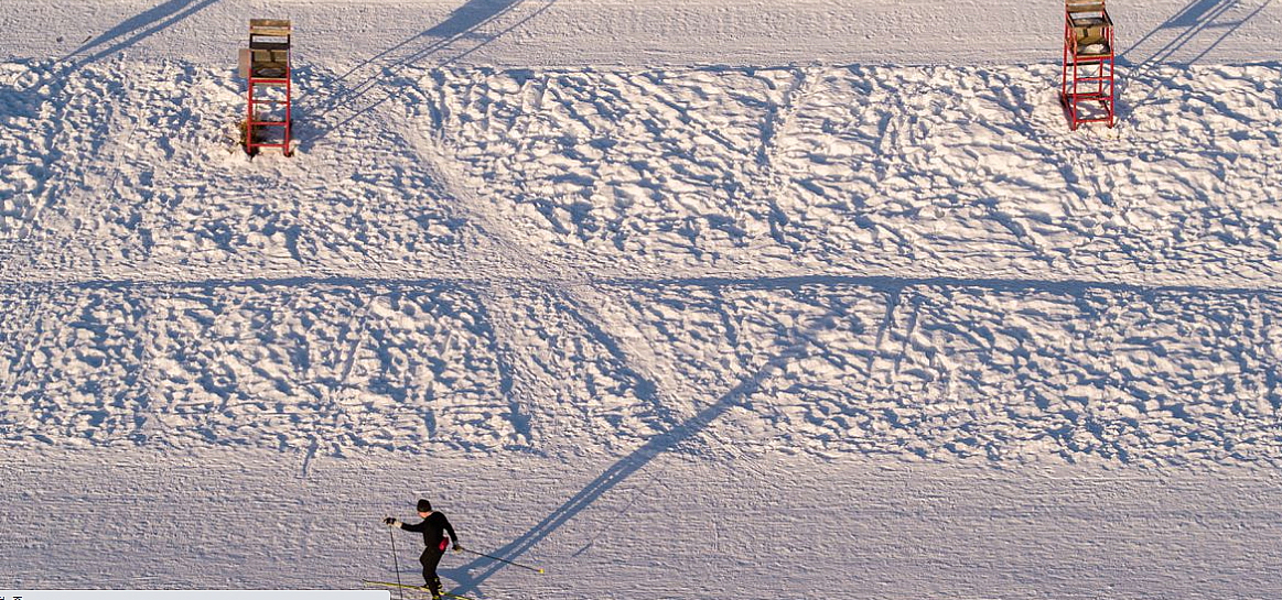 산책로에서 조깅을 하거나 , 스키를 즐기는 이들이