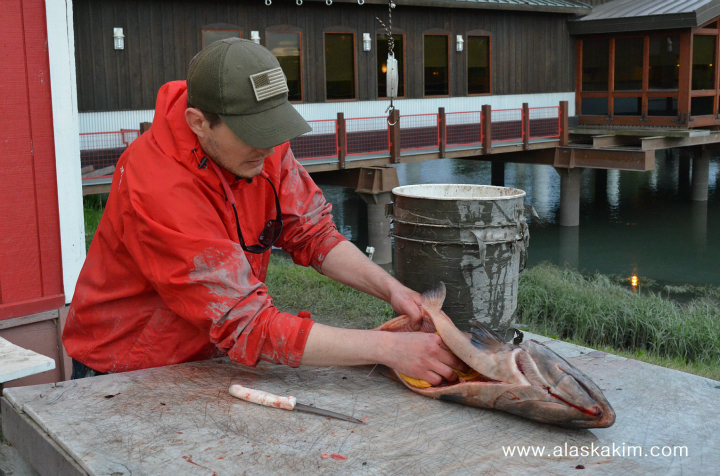 수놈 왕연어를 잡아서 바로 손질을 하고 있는 중입니다.