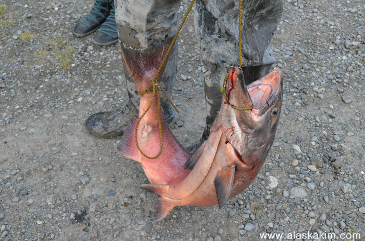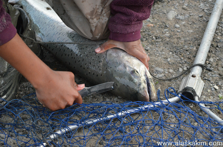 꼬맹이가 칼을 꺼내더니 , 아주 능숙하게 연어의 숨통을 끊어 놓습니다.