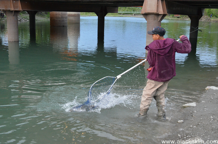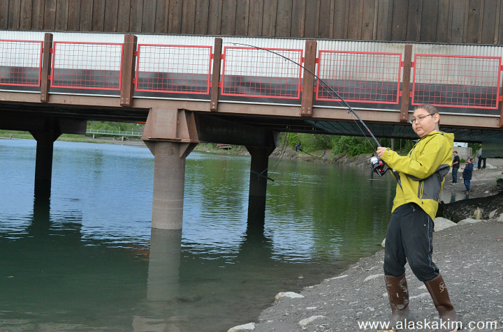 앗! 이때 아이의 낚싯대에 왕연어가 갈렸습니다.