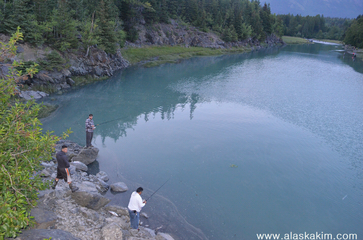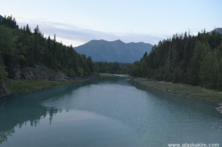 다리 밑에서도 연어 낚시가 한창입니다.