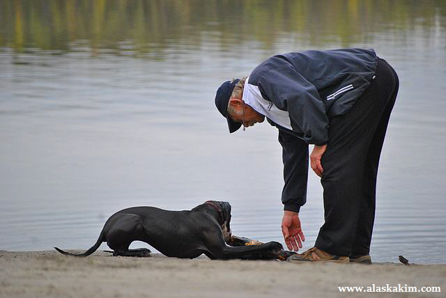 주인과 견공이 좋은 시간을 갖고 있네요. 보기에는 사나워 보이는데