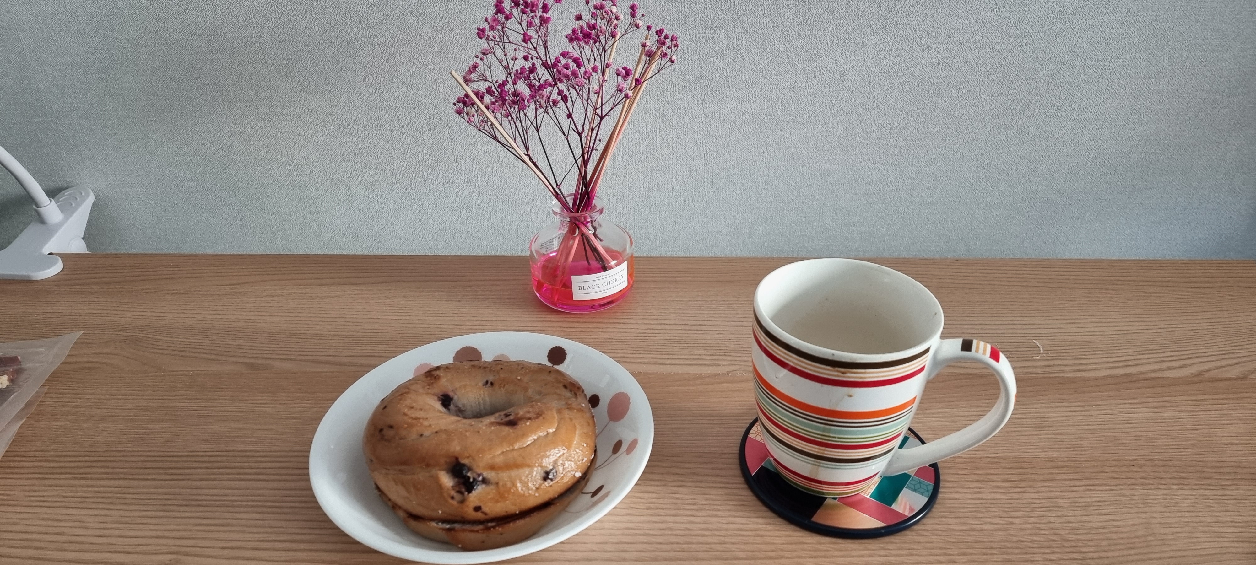 아침에 일어나 잼을 바른 베이글과 코피 한잔으로