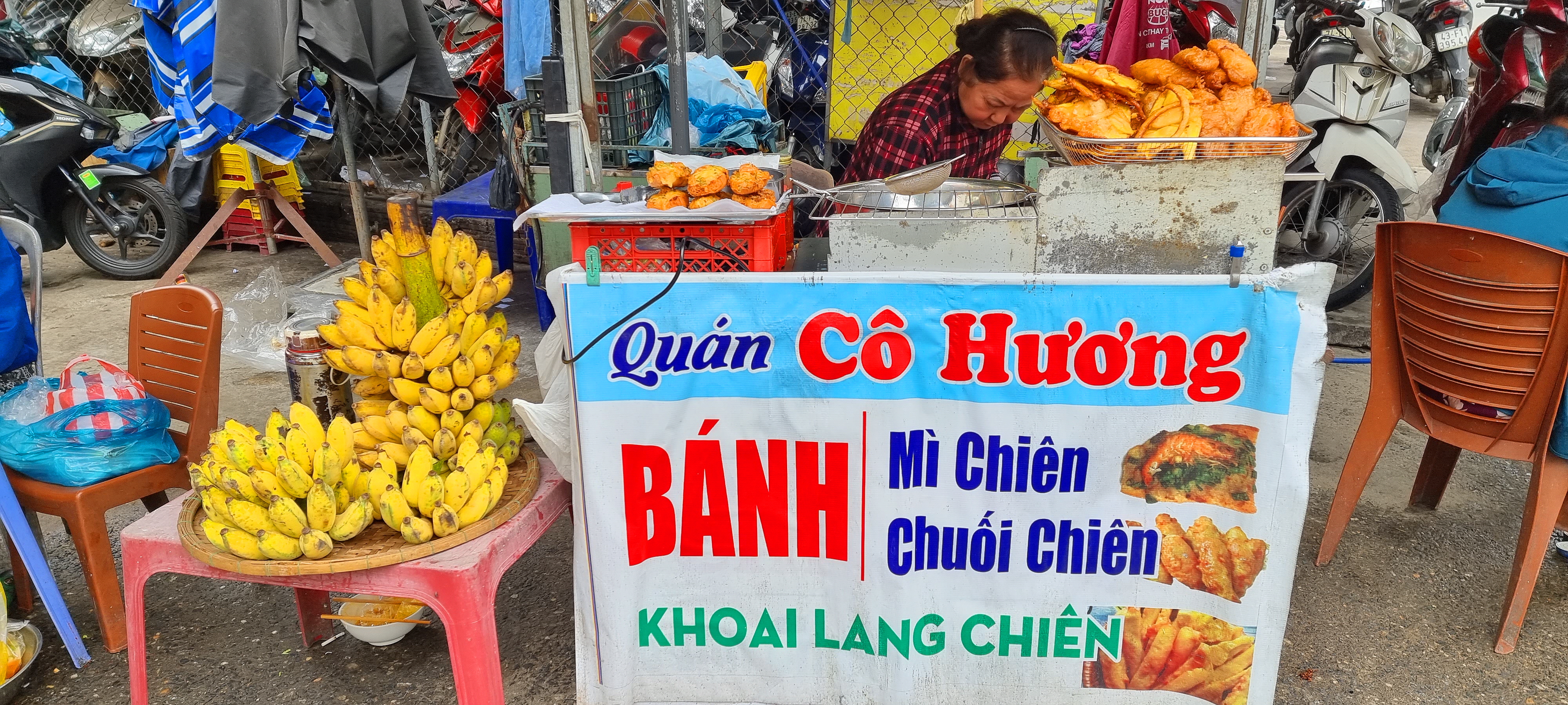 바나나, 고구마, 새우튀김을 팔고 있네요.