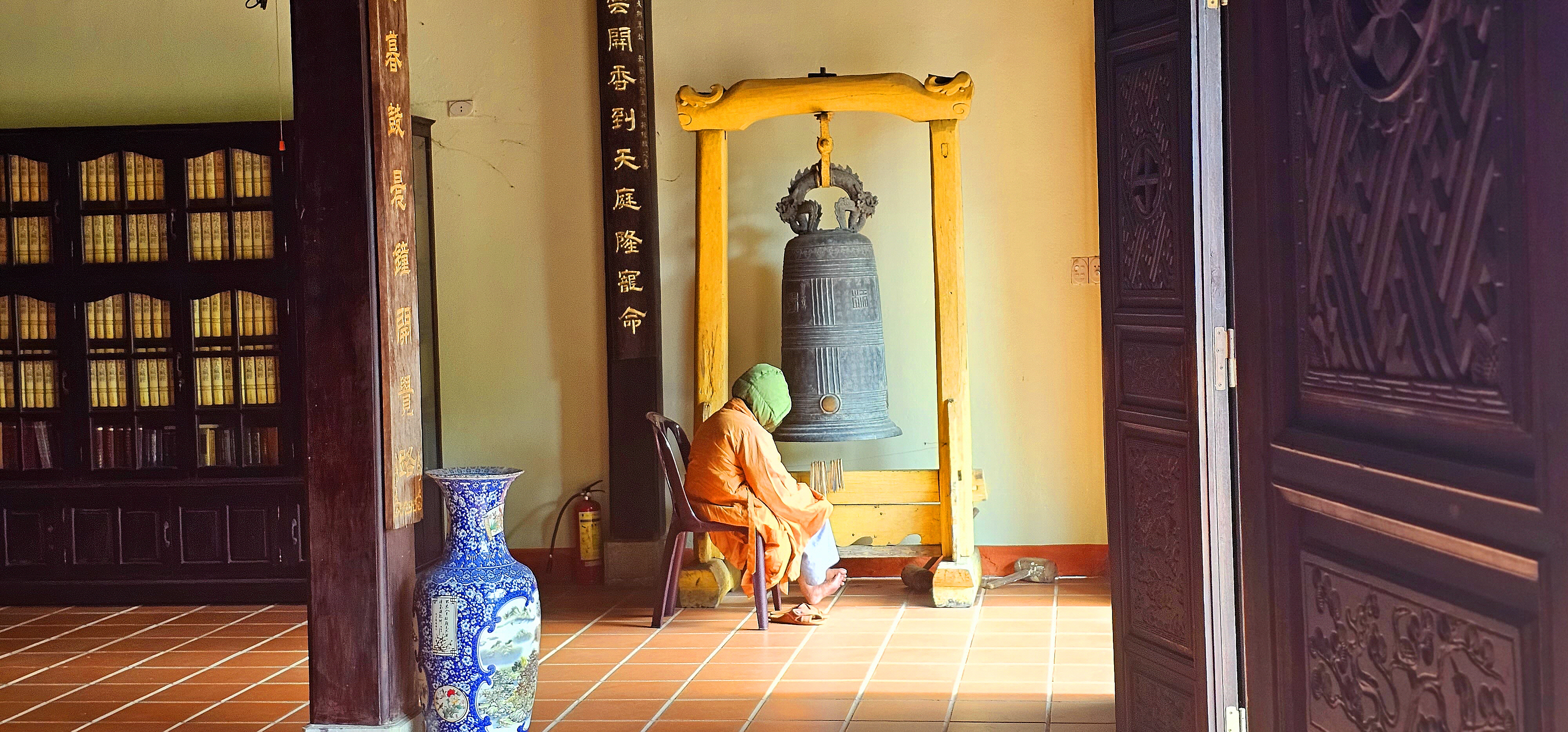 점심이 되자, 점심 예불을 위한 종을 치고 계시는데