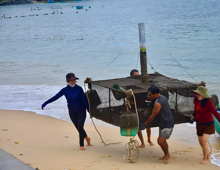 코코넛배를 이용해 어구를 부랴부랴