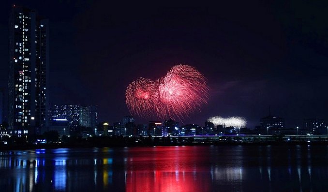 다낭 한강에서의 불꽃놀이 축제는 저녁